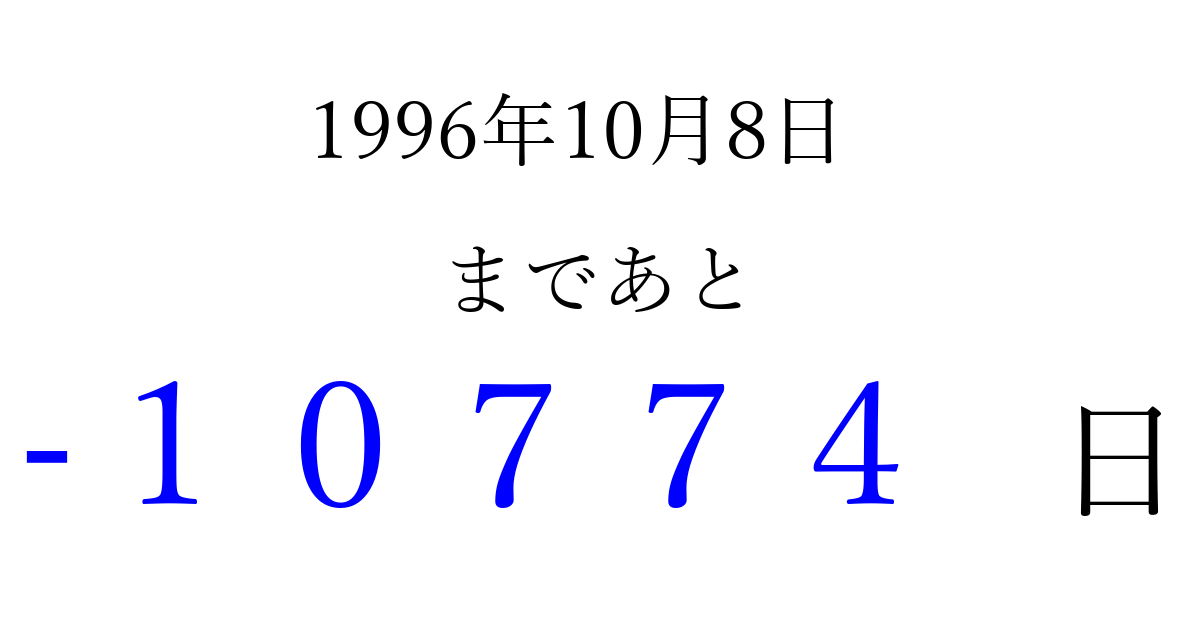 1996年10月8日(火)は もう 00000 日過ぎました 追加すると、トップページからすぐ選べるようになります ※2026/04/08現在の結果です。 最新の状態に更新する ↓シェアして、タイムライン上にカウントダウンを表示しよう!↓ 📤 この結果を共有する Tweet シェア Threads Bluesky 別の日付でカウントダウン 1996年10月のカレンダー このページをブックマークに追加すると、いつでもカウントダウンを確認できます。 (PC: Ctrl+D / Mac: ⌘+D) hitome-notes.comでは以下のページも運営しています。 指定日と期間から日付を計算 | ガチャ確率計算・シミュレーション | プライバシー・ポリシー 運営者:Avocado