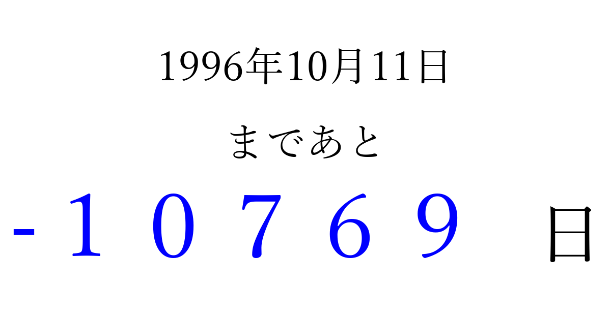 1996年10月11日(金)は もう 00000 日過ぎました 追加すると、トップページからすぐ選べるようになります ※2026/04/06現在の結果です。 最新の状態に更新する ↓シェアして、タイムライン上にカウントダウンを表示しよう!↓ 📤 この結果を共有する Tweet シェア Threads Bluesky 別の日付でカウントダウン 1996年10月のカレンダー このページをブックマークに追加すると、いつでもカウントダウンを確認できます。 (PC: Ctrl+D / Mac: ⌘+D) hitome-notes.comでは以下のページも運営しています。 指定日と期間から日付を計算 | ガチャ確率計算・シミュレーション | プライバシー・ポリシー 運営者:Avocado