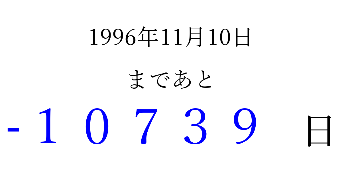 1996年11月10日(日)は もう 00000 日過ぎました 追加すると、トップページからすぐ選べるようになります ※2026/04/06現在の結果です。 最新の状態に更新する ↓シェアして、タイムライン上にカウントダウンを表示しよう!↓ 📤 この結果を共有する Tweet シェア Threads Bluesky 別の日付でカウントダウン 1996年11月のカレンダー このページをブックマークに追加すると、いつでもカウントダウンを確認できます。 (PC: Ctrl+D / Mac: ⌘+D) hitome-notes.comでは以下のページも運営しています。 指定日と期間から日付を計算 | ガチャ確率計算・シミュレーション | プライバシー・ポリシー 運営者:Avocado