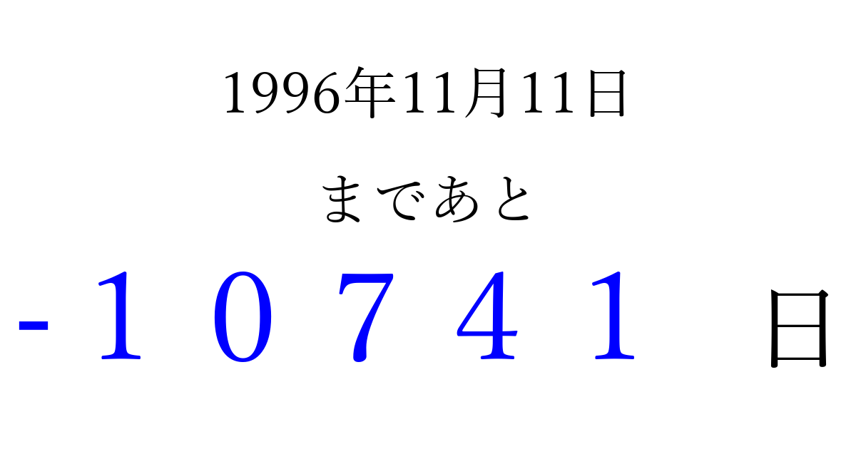 1996年11月11日(月)は もう 00000 日過ぎました 追加すると、トップページからすぐ選べるようになります ※2026/04/09現在の結果です。 最新の状態に更新する ↓シェアして、タイムライン上にカウントダウンを表示しよう!↓ 📤 この結果を共有する Tweet シェア Threads Bluesky 別の日付でカウントダウン 1996年11月のカレンダー このページをブックマークに追加すると、いつでもカウントダウンを確認できます。 (PC: Ctrl+D / Mac: ⌘+D) hitome-notes.comでは以下のページも運営しています。 指定日と期間から日付を計算 | ガチャ確率計算・シミュレーション | プライバシー・ポリシー 運営者:Avocado