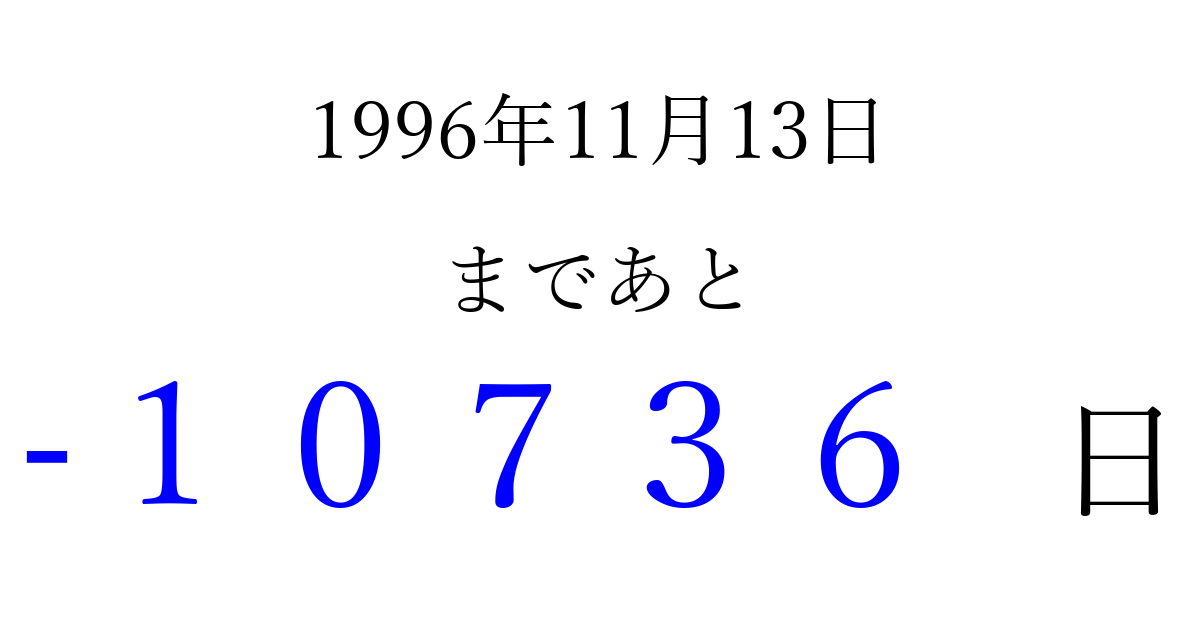 1996年11月13日(水)は もう 00000 日過ぎました 追加すると、トップページからすぐ選べるようになります ※2026/04/06現在の結果です。 最新の状態に更新する ↓シェアして、タイムライン上にカウントダウンを表示しよう!↓ 📤 この結果を共有する Tweet シェア Threads Bluesky 別の日付でカウントダウン 1996年11月のカレンダー このページをブックマークに追加すると、いつでもカウントダウンを確認できます。 (PC: Ctrl+D / Mac: ⌘+D) hitome-notes.comでは以下のページも運営しています。 指定日と期間から日付を計算 | ガチャ確率計算・シミュレーション | プライバシー・ポリシー 運営者:Avocado