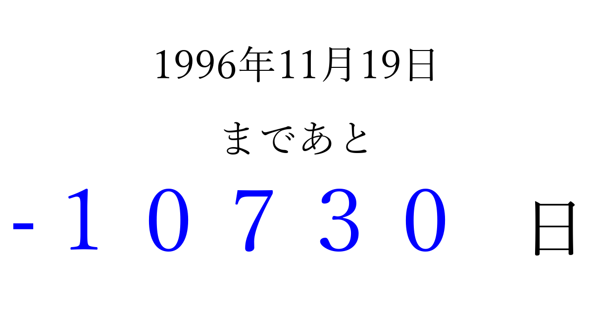 1996年11月19日(火)は もう 00000 日過ぎました 追加すると、トップページからすぐ選べるようになります ※2026/04/06現在の結果です。 最新の状態に更新する ↓シェアして、タイムライン上にカウントダウンを表示しよう!↓ 📤 この結果を共有する Tweet シェア Threads Bluesky 別の日付でカウントダウン 1996年11月のカレンダー このページをブックマークに追加すると、いつでもカウントダウンを確認できます。 (PC: Ctrl+D / Mac: ⌘+D) hitome-notes.comでは以下のページも運営しています。 指定日と期間から日付を計算 | ガチャ確率計算・シミュレーション | プライバシー・ポリシー 運営者:Avocado