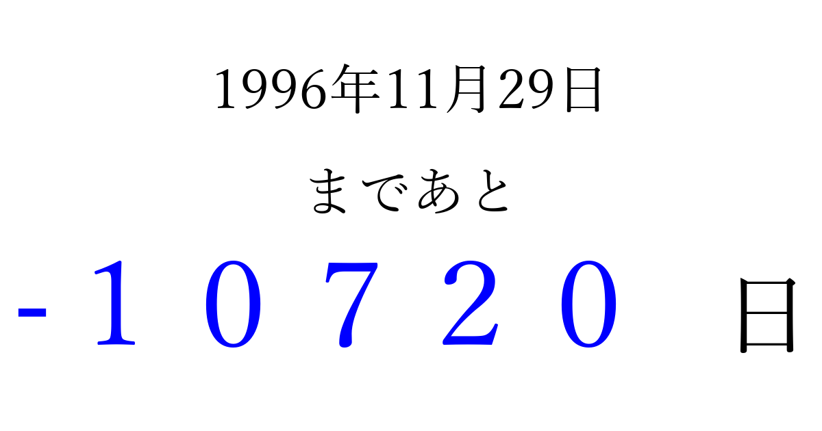 1996年11月29日(金)は もう 00000 日過ぎました 追加すると、トップページからすぐ選べるようになります ※2026/04/06現在の結果です。 最新の状態に更新する ↓シェアして、タイムライン上にカウントダウンを表示しよう!↓ 📤 この結果を共有する Tweet シェア Threads Bluesky 別の日付でカウントダウン 1996年11月のカレンダー このページをブックマークに追加すると、いつでもカウントダウンを確認できます。 (PC: Ctrl+D / Mac: ⌘+D) hitome-notes.comでは以下のページも運営しています。 指定日と期間から日付を計算 | ガチャ確率計算・シミュレーション | プライバシー・ポリシー 運営者:Avocado