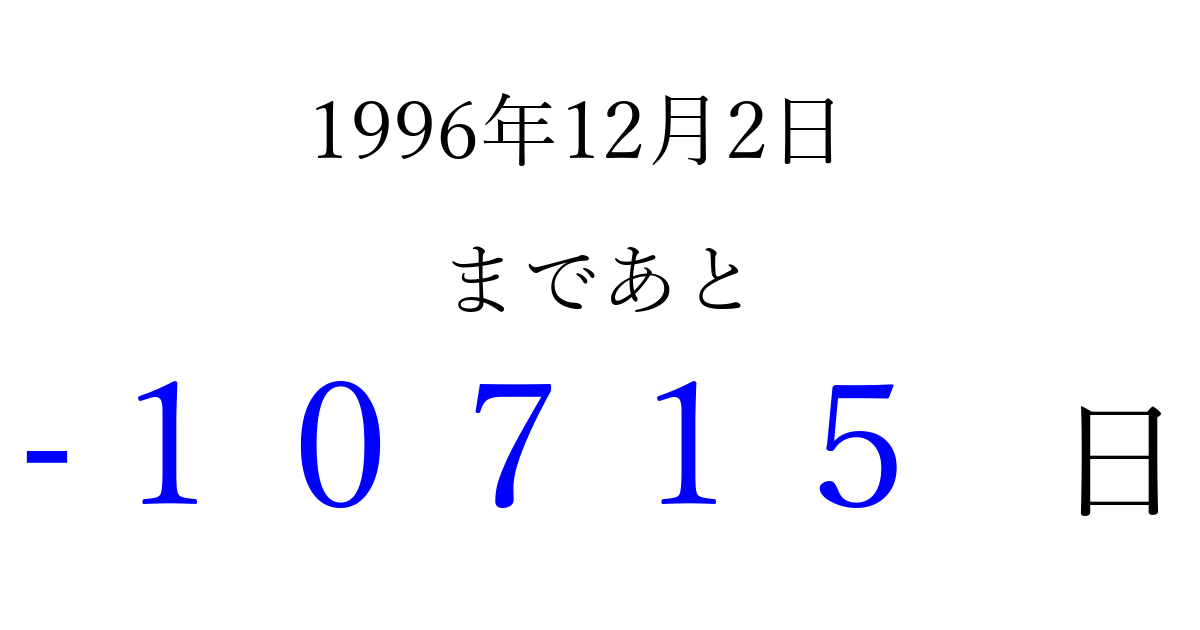 1996年12月2日(月)は もう 00000 日過ぎました 追加すると、トップページからすぐ選べるようになります ※2026/04/04現在の結果です。 最新の状態に更新する ↓シェアして、タイムライン上にカウントダウンを表示しよう!↓ 📤 この結果を共有する Tweet シェア Threads Bluesky 別の日付でカウントダウン 1996年12月のカレンダー このページをブックマークに追加すると、いつでもカウントダウンを確認できます。 (PC: Ctrl+D / Mac: ⌘+D) hitome-notes.comでは以下のページも運営しています。 指定日と期間から日付を計算 | ガチャ確率計算・シミュレーション | プライバシー・ポリシー 運営者:Avocado