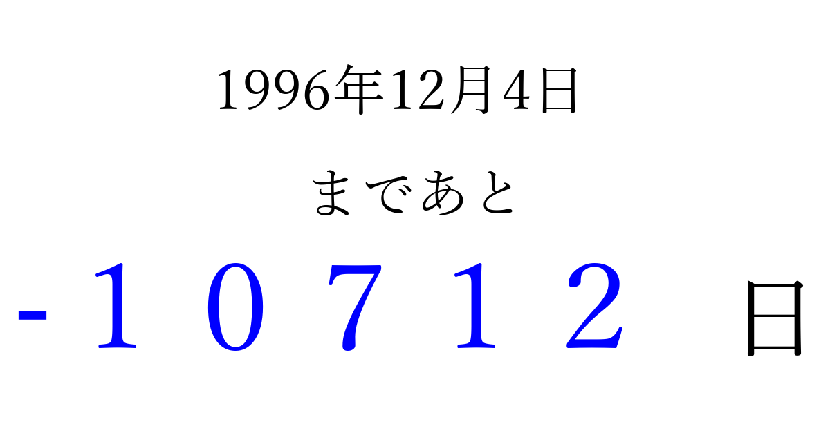 1996年12月4日(水)は もう 00000 日過ぎました 追加すると、トップページからすぐ選べるようになります ※2026/04/03現在の結果です。 最新の状態に更新する ↓シェアして、タイムライン上にカウントダウンを表示しよう!↓ 📤 この結果を共有する Tweet シェア Threads Bluesky 別の日付でカウントダウン 1996年12月のカレンダー このページをブックマークに追加すると、いつでもカウントダウンを確認できます。 (PC: Ctrl+D / Mac: ⌘+D) hitome-notes.comでは以下のページも運営しています。 指定日と期間から日付を計算 | ガチャ確率計算・シミュレーション | プライバシー・ポリシー 運営者:Avocado
