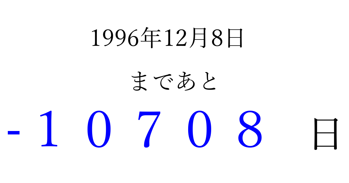 1996年12月8日(日)は もう 00000 日過ぎました 追加すると、トップページからすぐ選べるようになります ※2026/04/03現在の結果です。 最新の状態に更新する ↓シェアして、タイムライン上にカウントダウンを表示しよう!↓ 📤 この結果を共有する Tweet シェア Threads Bluesky 別の日付でカウントダウン 1996年12月のカレンダー このページをブックマークに追加すると、いつでもカウントダウンを確認できます。 (PC: Ctrl+D / Mac: ⌘+D) hitome-notes.comでは以下のページも運営しています。 指定日と期間から日付を計算 | ガチャ確率計算・シミュレーション | プライバシー・ポリシー 運営者:Avocado