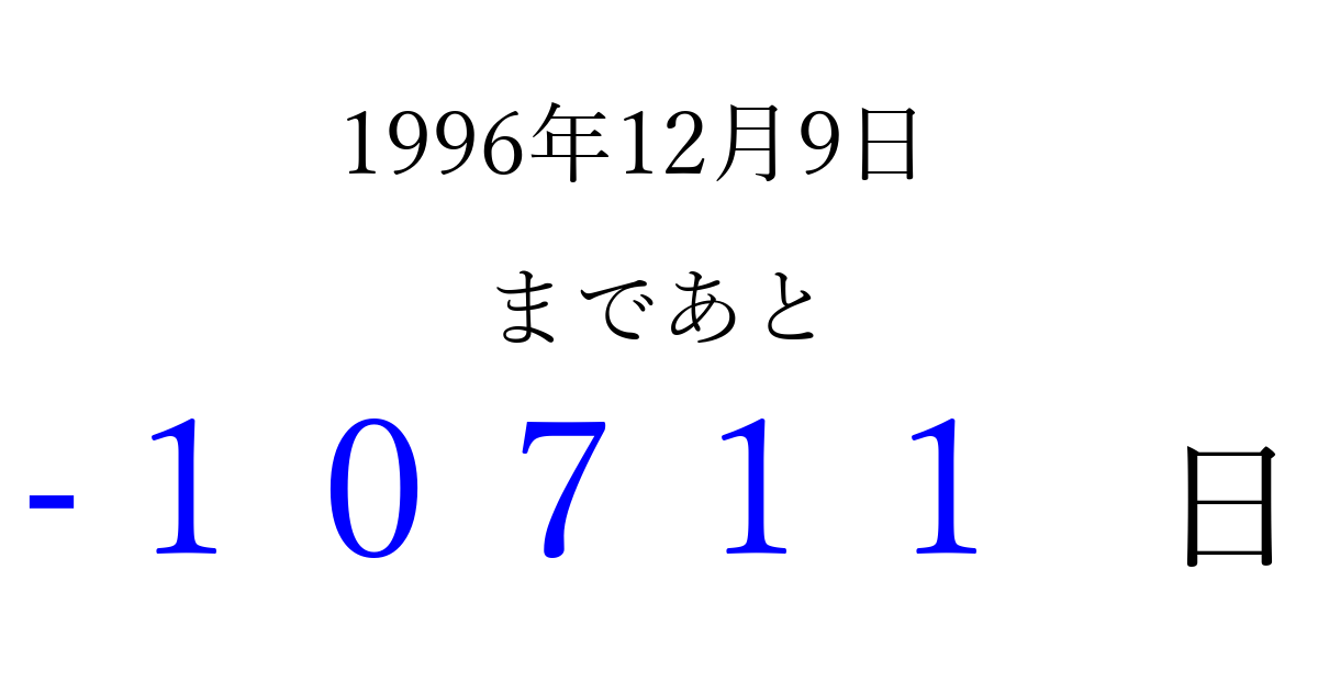 1996年12月9日(月)は もう 00000 日過ぎました 追加すると、トップページからすぐ選べるようになります ※2026/04/07現在の結果です。 最新の状態に更新する ↓シェアして、タイムライン上にカウントダウンを表示しよう!↓ 📤 この結果を共有する Tweet シェア Threads Bluesky 別の日付でカウントダウン 1996年12月のカレンダー このページをブックマークに追加すると、いつでもカウントダウンを確認できます。 (PC: Ctrl+D / Mac: ⌘+D) hitome-notes.comでは以下のページも運営しています。 指定日と期間から日付を計算 | ガチャ確率計算・シミュレーション | プライバシー・ポリシー 運営者:Avocado
