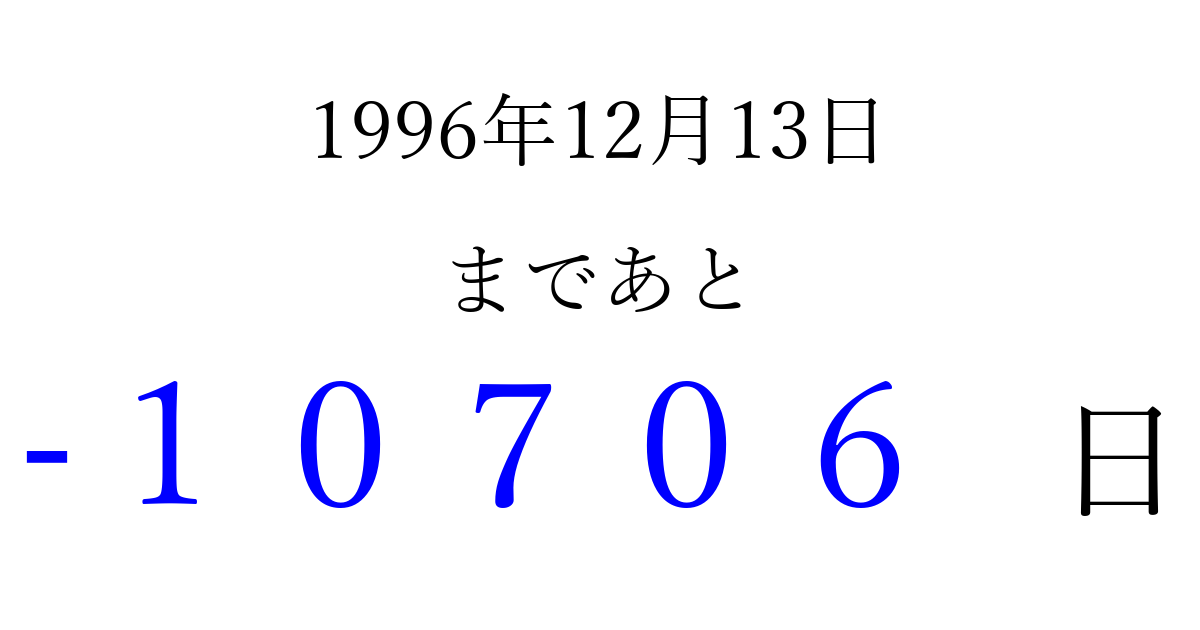 1996年12月13日(金)は もう 00000 日過ぎました 追加すると、トップページからすぐ選べるようになります ※2026/04/06現在の結果です。 最新の状態に更新する ↓シェアして、タイムライン上にカウントダウンを表示しよう!↓ 📤 この結果を共有する Tweet シェア Threads Bluesky 別の日付でカウントダウン 1996年12月のカレンダー このページをブックマークに追加すると、いつでもカウントダウンを確認できます。 (PC: Ctrl+D / Mac: ⌘+D) hitome-notes.comでは以下のページも運営しています。 指定日と期間から日付を計算 | ガチャ確率計算・シミュレーション | プライバシー・ポリシー 運営者:Avocado