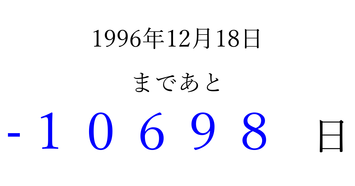 1996年12月18日(水)は もう 00000 日過ぎました 追加すると、トップページからすぐ選べるようになります ※2026/04/03現在の結果です。 最新の状態に更新する ↓シェアして、タイムライン上にカウントダウンを表示しよう!↓ 📤 この結果を共有する Tweet シェア Threads Bluesky 別の日付でカウントダウン 1996年12月のカレンダー このページをブックマークに追加すると、いつでもカウントダウンを確認できます。 (PC: Ctrl+D / Mac: ⌘+D) hitome-notes.comでは以下のページも運営しています。 指定日と期間から日付を計算 | ガチャ確率計算・シミュレーション | プライバシー・ポリシー 運営者:Avocado