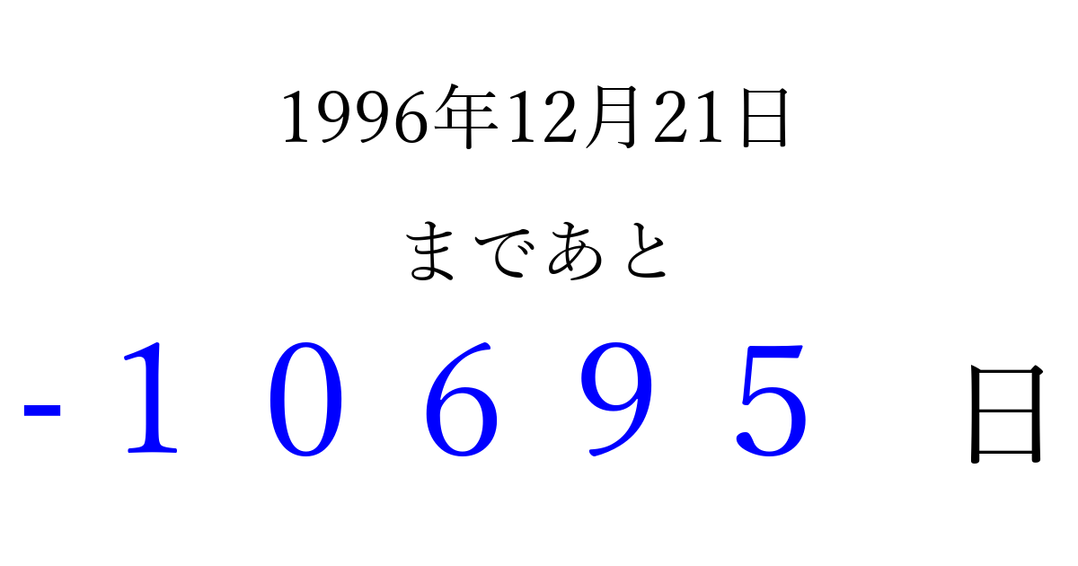 1996年12月21日(土)は もう 00000 日過ぎました 追加すると、トップページからすぐ選べるようになります ※2026/04/03現在の結果です。 最新の状態に更新する ↓シェアして、タイムライン上にカウントダウンを表示しよう!↓ 📤 この結果を共有する Tweet シェア Threads Bluesky 別の日付でカウントダウン 1996年12月のカレンダー このページをブックマークに追加すると、いつでもカウントダウンを確認できます。 (PC: Ctrl+D / Mac: ⌘+D) hitome-notes.comでは以下のページも運営しています。 指定日と期間から日付を計算 | ガチャ確率計算・シミュレーション | プライバシー・ポリシー 運営者:Avocado
