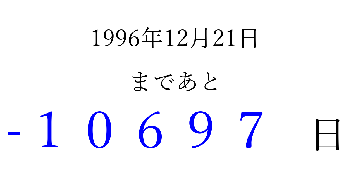 1996年12月21日(土)は もう 00000 日過ぎました 追加すると、トップページからすぐ選べるようになります ※2026/04/05現在の結果です。 最新の状態に更新する ↓シェアして、タイムライン上にカウントダウンを表示しよう!↓ 📤 この結果を共有する Tweet シェア Threads Bluesky 別の日付でカウントダウン 1996年12月のカレンダー このページをブックマークに追加すると、いつでもカウントダウンを確認できます。 (PC: Ctrl+D / Mac: ⌘+D) hitome-notes.comでは以下のページも運営しています。 指定日と期間から日付を計算 | ガチャ確率計算・シミュレーション | プライバシー・ポリシー 運営者:Avocado