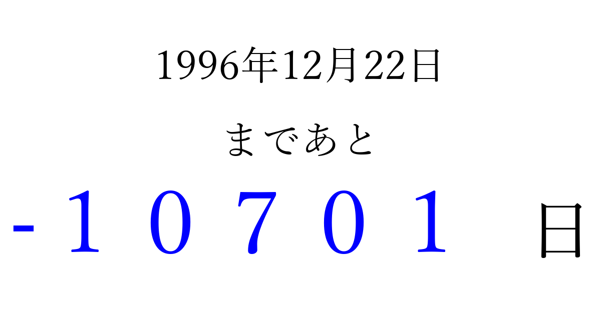 1996年12月22日(日)は もう 00000 日過ぎました 追加すると、トップページからすぐ選べるようになります ※2026/04/10現在の結果です。 最新の状態に更新する ↓シェアして、タイムライン上にカウントダウンを表示しよう!↓ 📤 この結果を共有する Tweet シェア Threads Bluesky 別の日付でカウントダウン 1996年12月のカレンダー このページをブックマークに追加すると、いつでもカウントダウンを確認できます。 (PC: Ctrl+D / Mac: ⌘+D) hitome-notes.comでは以下のページも運営しています。 指定日と期間から日付を計算 | ガチャ確率計算・シミュレーション | プライバシー・ポリシー 運営者:Avocado