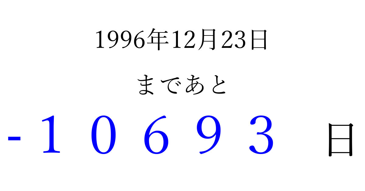 1996年12月23日(月)は もう 00000 日過ぎました 追加すると、トップページからすぐ選べるようになります ※2026/04/03現在の結果です。 最新の状態に更新する ↓シェアして、タイムライン上にカウントダウンを表示しよう!↓ 📤 この結果を共有する Tweet シェア Threads Bluesky 別の日付でカウントダウン 1996年12月のカレンダー このページをブックマークに追加すると、いつでもカウントダウンを確認できます。 (PC: Ctrl+D / Mac: ⌘+D) hitome-notes.comでは以下のページも運営しています。 指定日と期間から日付を計算 | ガチャ確率計算・シミュレーション | プライバシー・ポリシー 運営者:Avocado