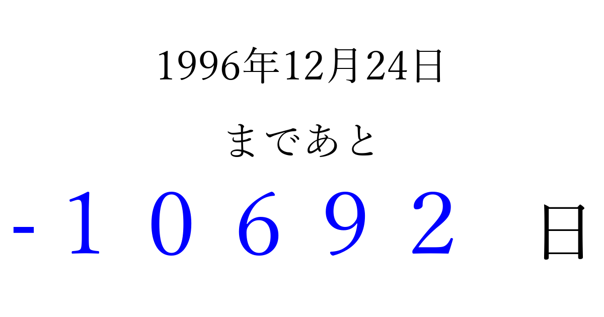 1996年12月24日(火)は もう 00000 日過ぎました 追加すると、トップページからすぐ選べるようになります ※2026/04/03現在の結果です。 最新の状態に更新する ↓シェアして、タイムライン上にカウントダウンを表示しよう!↓ 📤 この結果を共有する Tweet シェア Threads Bluesky 別の日付でカウントダウン 1996年12月のカレンダー このページをブックマークに追加すると、いつでもカウントダウンを確認できます。 (PC: Ctrl+D / Mac: ⌘+D) hitome-notes.comでは以下のページも運営しています。 指定日と期間から日付を計算 | ガチャ確率計算・シミュレーション | プライバシー・ポリシー 運営者:Avocado