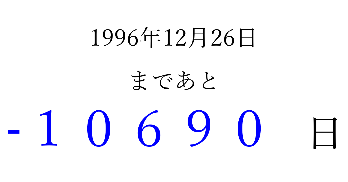 1996年12月26日(木)は もう 00000 日過ぎました 追加すると、トップページからすぐ選べるようになります ※2026/04/03現在の結果です。 最新の状態に更新する ↓シェアして、タイムライン上にカウントダウンを表示しよう!↓ 📤 この結果を共有する Tweet シェア Threads Bluesky 別の日付でカウントダウン 1996年12月のカレンダー このページをブックマークに追加すると、いつでもカウントダウンを確認できます。 (PC: Ctrl+D / Mac: ⌘+D) hitome-notes.comでは以下のページも運営しています。 指定日と期間から日付を計算 | ガチャ確率計算・シミュレーション | プライバシー・ポリシー 運営者:Avocado