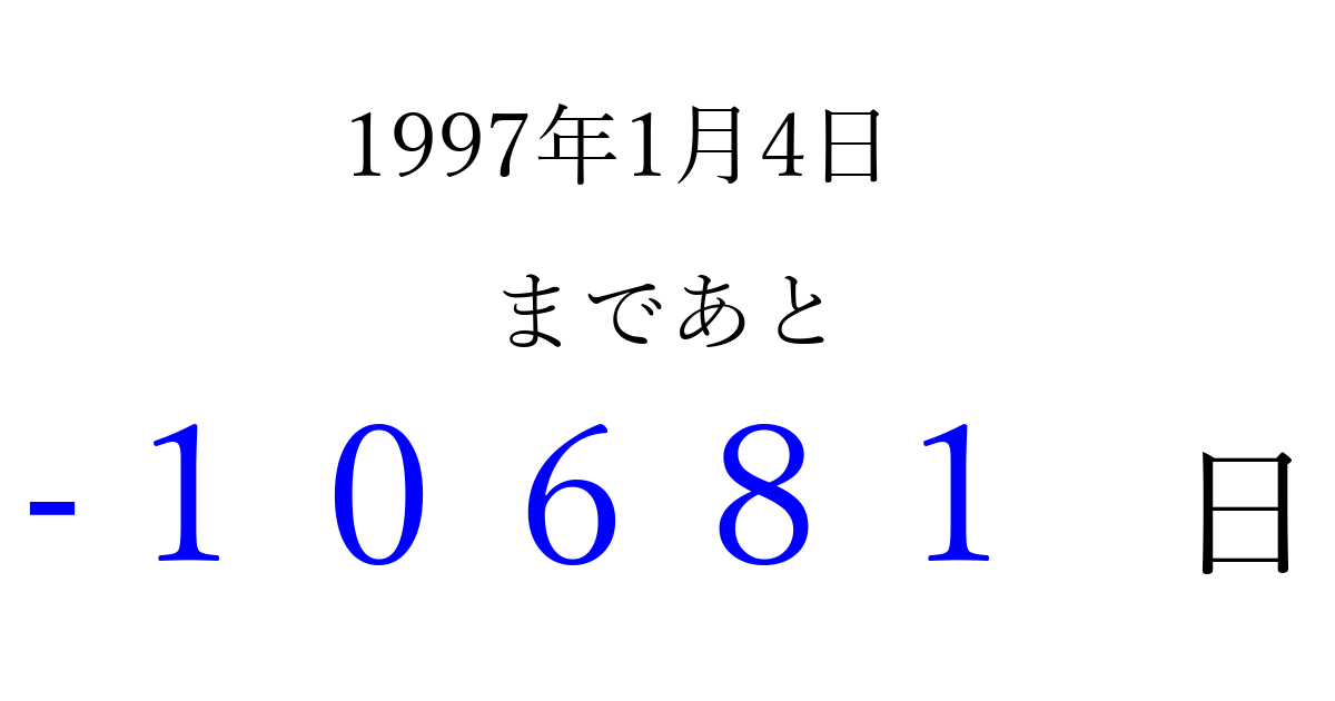 1997年1月4日(土)は もう 00000 日過ぎました 追加すると、トップページからすぐ選べるようになります ※2026/04/03現在の結果です。 最新の状態に更新する ↓シェアして、タイムライン上にカウントダウンを表示しよう!↓ 📤 この結果を共有する Tweet シェア Threads Bluesky 別の日付でカウントダウン 1997年1月のカレンダー このページをブックマークに追加すると、いつでもカウントダウンを確認できます。 (PC: Ctrl+D / Mac: ⌘+D) hitome-notes.comでは以下のページも運営しています。 指定日と期間から日付を計算 | ガチャ確率計算・シミュレーション | プライバシー・ポリシー 運営者:Avocado