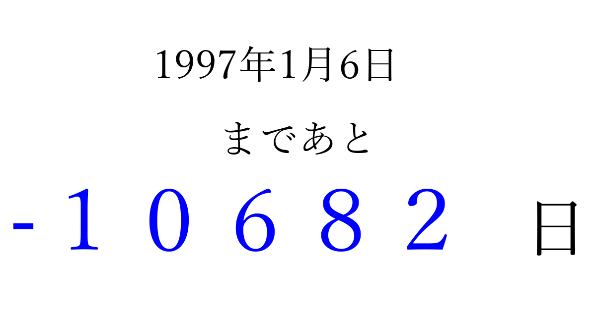 1997年1月6日(月)は もう 00000 日過ぎました 追加すると、トップページからすぐ選べるようになります ※2026/04/06現在の結果です。 最新の状態に更新する ↓シェアして、タイムライン上にカウントダウンを表示しよう!↓ 📤 この結果を共有する Tweet シェア Threads Bluesky 別の日付でカウントダウン 1997年1月のカレンダー このページをブックマークに追加すると、いつでもカウントダウンを確認できます。 (PC: Ctrl+D / Mac: ⌘+D) hitome-notes.comでは以下のページも運営しています。 指定日と期間から日付を計算 | ガチャ確率計算・シミュレーション | プライバシー・ポリシー 運営者:Avocado
