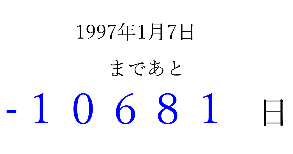 1997年1月7日(火)は もう 00000 日過ぎました 追加すると、トップページからすぐ選べるようになります ※2026/04/06現在の結果です。 最新の状態に更新する ↓シェアして、タイムライン上にカウントダウンを表示しよう!↓ 📤 この結果を共有する Tweet シェア Threads Bluesky 別の日付でカウントダウン 1997年1月のカレンダー このページをブックマークに追加すると、いつでもカウントダウンを確認できます。 (PC: Ctrl+D / Mac: ⌘+D) hitome-notes.comでは以下のページも運営しています。 指定日と期間から日付を計算 | ガチャ確率計算・シミュレーション | プライバシー・ポリシー 運営者:Avocado