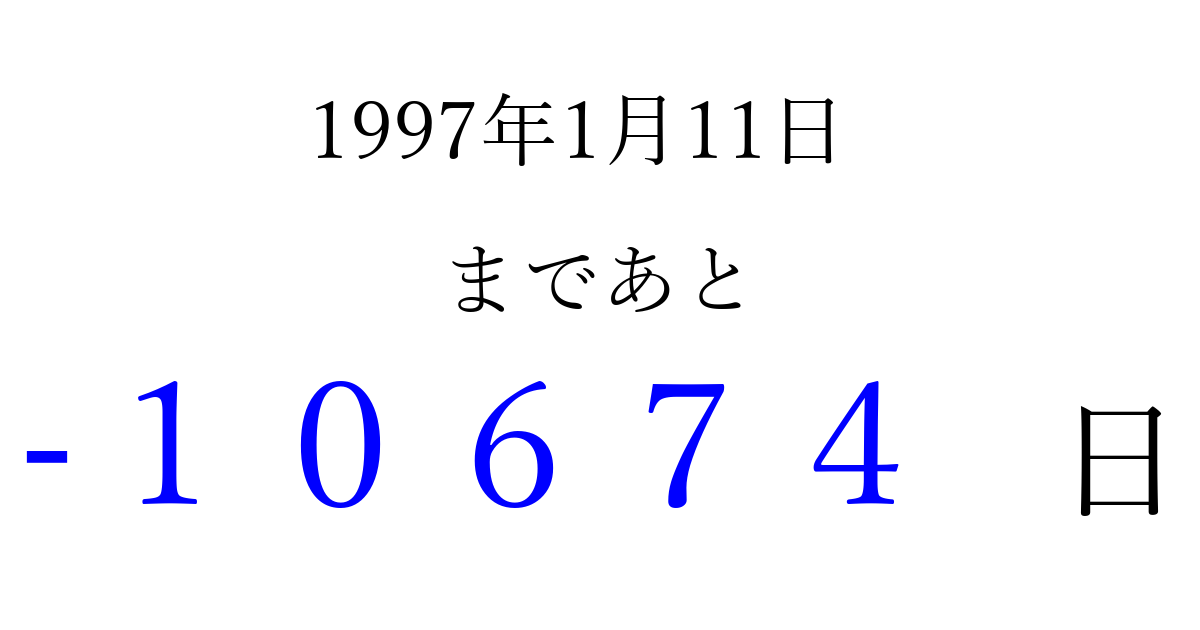 1997年1月11日(土)は もう 00000 日過ぎました 追加すると、トップページからすぐ選べるようになります ※2026/04/03現在の結果です。 最新の状態に更新する ↓シェアして、タイムライン上にカウントダウンを表示しよう!↓ 📤 この結果を共有する Tweet シェア Threads Bluesky 別の日付でカウントダウン 1997年1月のカレンダー このページをブックマークに追加すると、いつでもカウントダウンを確認できます。 (PC: Ctrl+D / Mac: ⌘+D) hitome-notes.comでは以下のページも運営しています。 指定日と期間から日付を計算 | ガチャ確率計算・シミュレーション | プライバシー・ポリシー 運営者:Avocado
