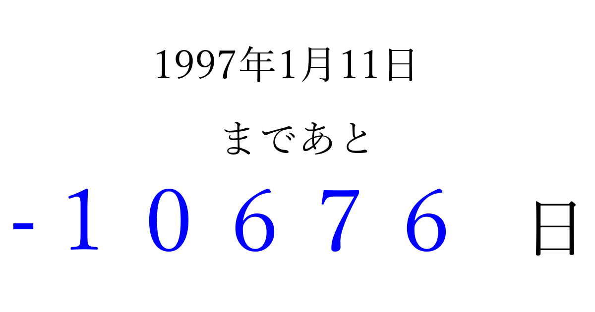 1997年1月11日(土)は もう 00000 日過ぎました 追加すると、トップページからすぐ選べるようになります ※2026/04/05現在の結果です。 最新の状態に更新する ↓シェアして、タイムライン上にカウントダウンを表示しよう!↓ 📤 この結果を共有する Tweet シェア Threads Bluesky 別の日付でカウントダウン 1997年1月のカレンダー このページをブックマークに追加すると、いつでもカウントダウンを確認できます。 (PC: Ctrl+D / Mac: ⌘+D) hitome-notes.comでは以下のページも運営しています。 指定日と期間から日付を計算 | ガチャ確率計算・シミュレーション | プライバシー・ポリシー 運営者:Avocado