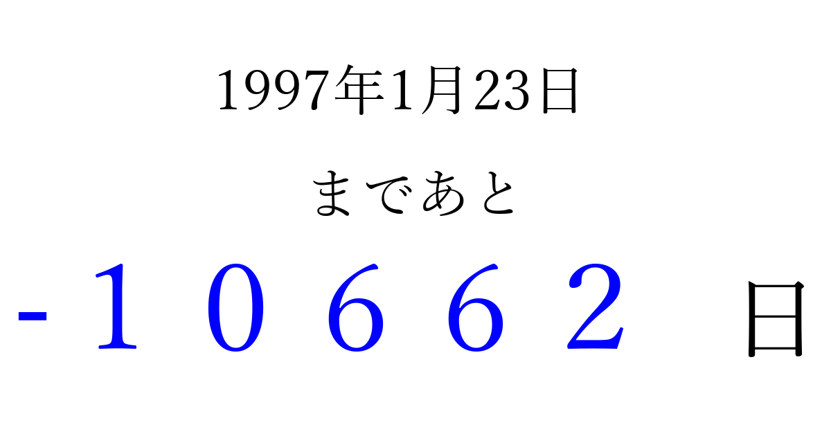 1997年1月23日(木)は もう 00000 日過ぎました 追加すると、トップページからすぐ選べるようになります ※2026/04/03現在の結果です。 最新の状態に更新する ↓シェアして、タイムライン上にカウントダウンを表示しよう!↓ 📤 この結果を共有する Tweet シェア Threads Bluesky 別の日付でカウントダウン 1997年1月のカレンダー このページをブックマークに追加すると、いつでもカウントダウンを確認できます。 (PC: Ctrl+D / Mac: ⌘+D) hitome-notes.comでは以下のページも運営しています。 指定日と期間から日付を計算 | ガチャ確率計算・シミュレーション | プライバシー・ポリシー 運営者:Avocado