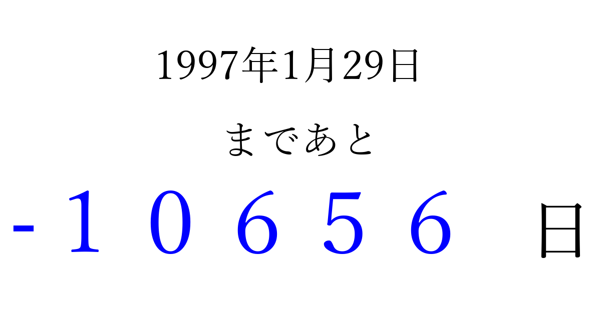 1997年1月29日(水)は もう 00000 日過ぎました 追加すると、トップページからすぐ選べるようになります ※2026/04/03現在の結果です。 最新の状態に更新する ↓シェアして、タイムライン上にカウントダウンを表示しよう!↓ 📤 この結果を共有する Tweet シェア Threads Bluesky 別の日付でカウントダウン 1997年1月のカレンダー このページをブックマークに追加すると、いつでもカウントダウンを確認できます。 (PC: Ctrl+D / Mac: ⌘+D) hitome-notes.comでは以下のページも運営しています。 指定日と期間から日付を計算 | ガチャ確率計算・シミュレーション | プライバシー・ポリシー 運営者:Avocado