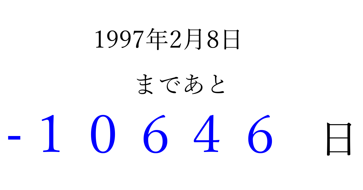 1997年2月8日(土)は もう 00000 日過ぎました 追加すると、トップページからすぐ選べるようになります ※2026/04/03現在の結果です。 最新の状態に更新する ↓シェアして、タイムライン上にカウントダウンを表示しよう!↓ 📤 この結果を共有する Tweet シェア Threads Bluesky 別の日付でカウントダウン 1997年2月のカレンダー このページをブックマークに追加すると、いつでもカウントダウンを確認できます。 (PC: Ctrl+D / Mac: ⌘+D) hitome-notes.comでは以下のページも運営しています。 指定日と期間から日付を計算 | ガチャ確率計算・シミュレーション | プライバシー・ポリシー 運営者:Avocado
