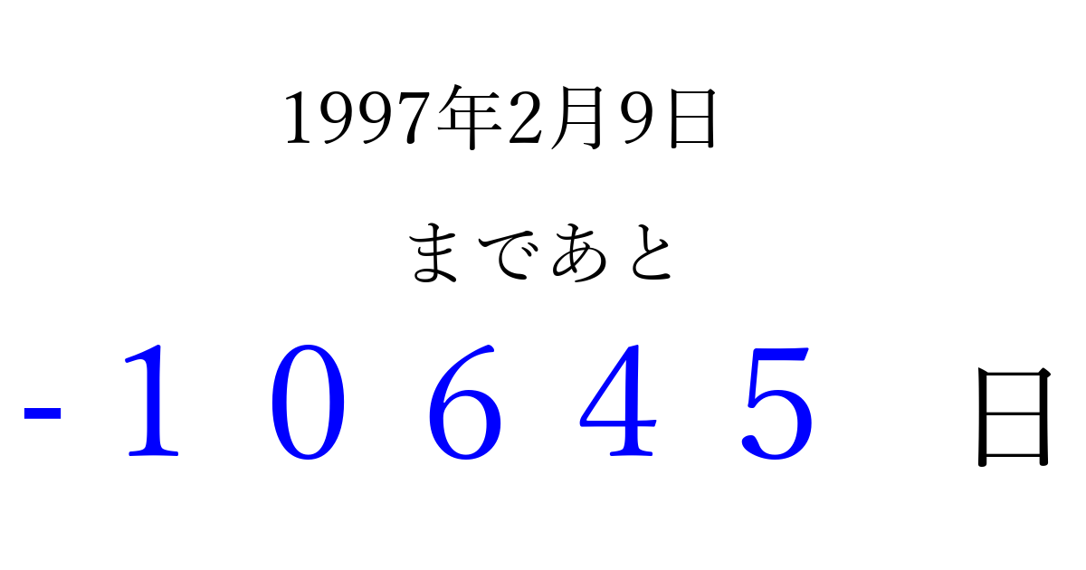 1997年2月9日(日)は もう 00000 日過ぎました 追加すると、トップページからすぐ選べるようになります ※2026/04/03現在の結果です。 最新の状態に更新する ↓シェアして、タイムライン上にカウントダウンを表示しよう!↓ 📤 この結果を共有する Tweet シェア Threads Bluesky 別の日付でカウントダウン 1997年2月のカレンダー このページをブックマークに追加すると、いつでもカウントダウンを確認できます。 (PC: Ctrl+D / Mac: ⌘+D) hitome-notes.comでは以下のページも運営しています。 指定日と期間から日付を計算 | ガチャ確率計算・シミュレーション | プライバシー・ポリシー 運営者:Avocado