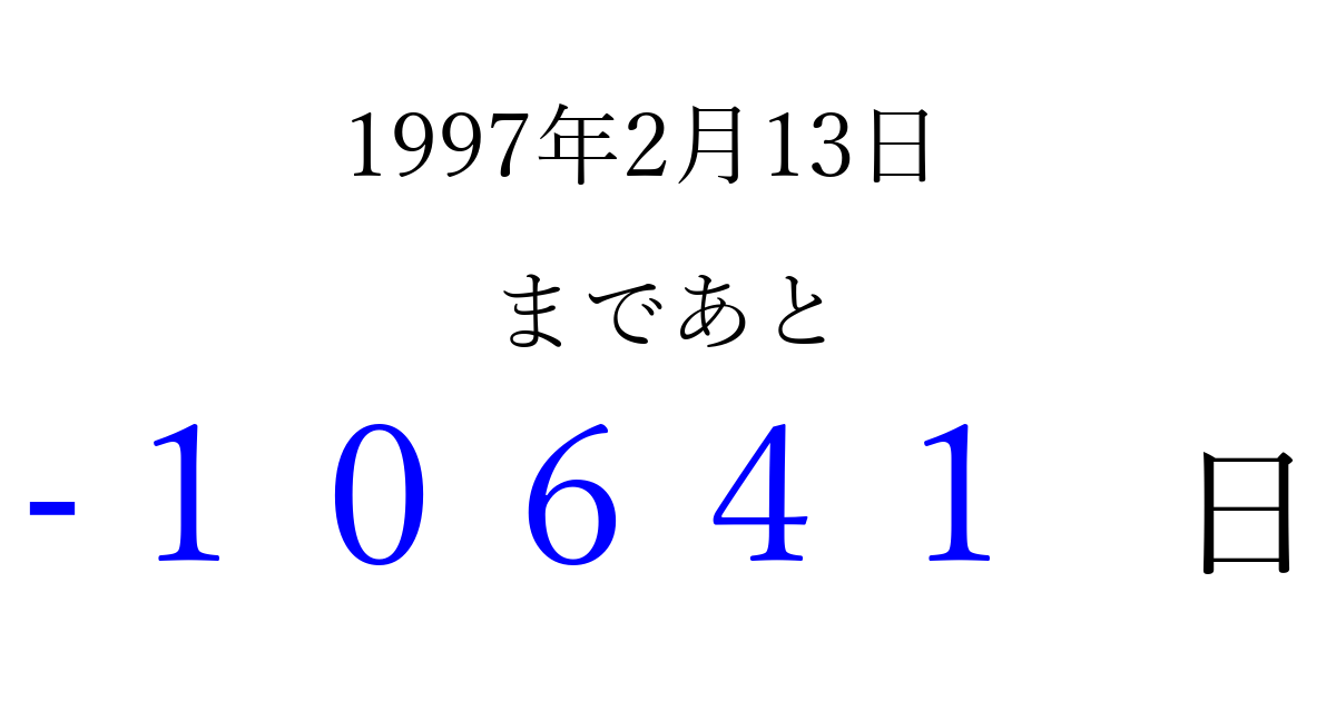 1997年2月13日(木)は もう 00000 日過ぎました 追加すると、トップページからすぐ選べるようになります ※2026/04/03現在の結果です。 最新の状態に更新する ↓シェアして、タイムライン上にカウントダウンを表示しよう!↓ 📤 この結果を共有する Tweet シェア Threads Bluesky 別の日付でカウントダウン 1997年2月のカレンダー このページをブックマークに追加すると、いつでもカウントダウンを確認できます。 (PC: Ctrl+D / Mac: ⌘+D) hitome-notes.comでは以下のページも運営しています。 指定日と期間から日付を計算 | ガチャ確率計算・シミュレーション | プライバシー・ポリシー 運営者:Avocado