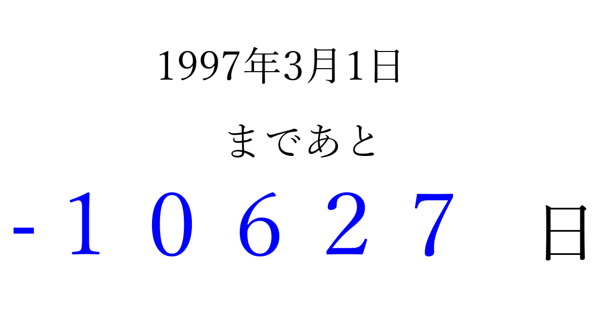 1997年3月1日(土)は もう 00000 日過ぎました 追加すると、トップページからすぐ選べるようになります ※2026/04/05現在の結果です。 最新の状態に更新する ↓シェアして、タイムライン上にカウントダウンを表示しよう!↓ 📤 この結果を共有する Tweet シェア Threads Bluesky 別の日付でカウントダウン 1997年3月のカレンダー このページをブックマークに追加すると、いつでもカウントダウンを確認できます。 (PC: Ctrl+D / Mac: ⌘+D) hitome-notes.comでは以下のページも運営しています。 指定日と期間から日付を計算 | ガチャ確率計算・シミュレーション | プライバシー・ポリシー 運営者:Avocado