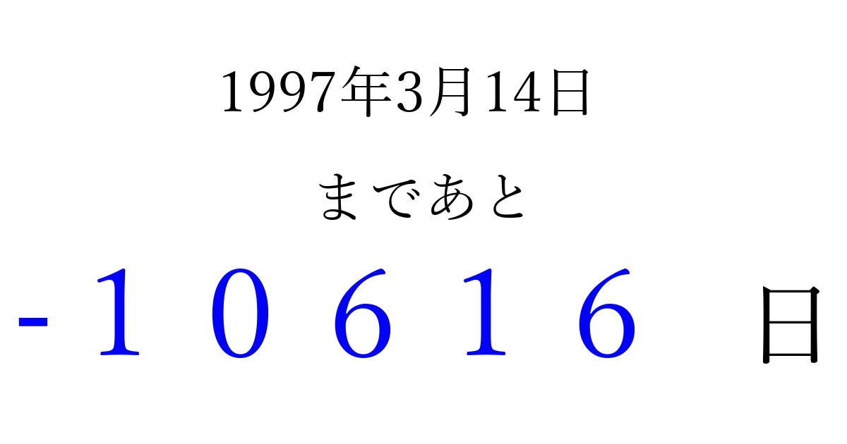 1997年3月14日(金)は もう 00000 日過ぎました 追加すると、トップページからすぐ選べるようになります ※2026/04/07現在の結果です。 最新の状態に更新する ↓シェアして、タイムライン上にカウントダウンを表示しよう!↓ 📤 この結果を共有する Tweet シェア Threads Bluesky 別の日付でカウントダウン 1997年3月のカレンダー このページをブックマークに追加すると、いつでもカウントダウンを確認できます。 (PC: Ctrl+D / Mac: ⌘+D) hitome-notes.comでは以下のページも運営しています。 指定日と期間から日付を計算 | ガチャ確率計算・シミュレーション | プライバシー・ポリシー 運営者:Avocado