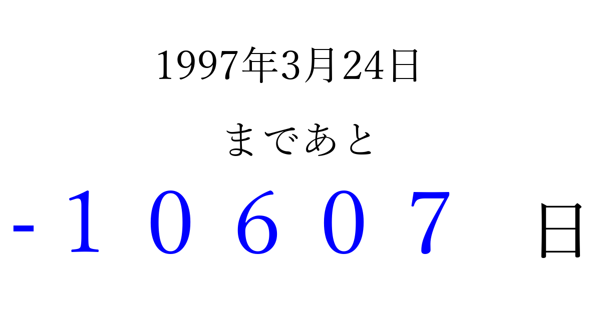 1997年3月24日(月)は もう 00000 日過ぎました 追加すると、トップページからすぐ選べるようになります ※2026/04/08現在の結果です。 最新の状態に更新する ↓シェアして、タイムライン上にカウントダウンを表示しよう!↓ 📤 この結果を共有する Tweet シェア Threads Bluesky 別の日付でカウントダウン 1997年3月のカレンダー このページをブックマークに追加すると、いつでもカウントダウンを確認できます。 (PC: Ctrl+D / Mac: ⌘+D) hitome-notes.comでは以下のページも運営しています。 指定日と期間から日付を計算 | ガチャ確率計算・シミュレーション | プライバシー・ポリシー 運営者:Avocado