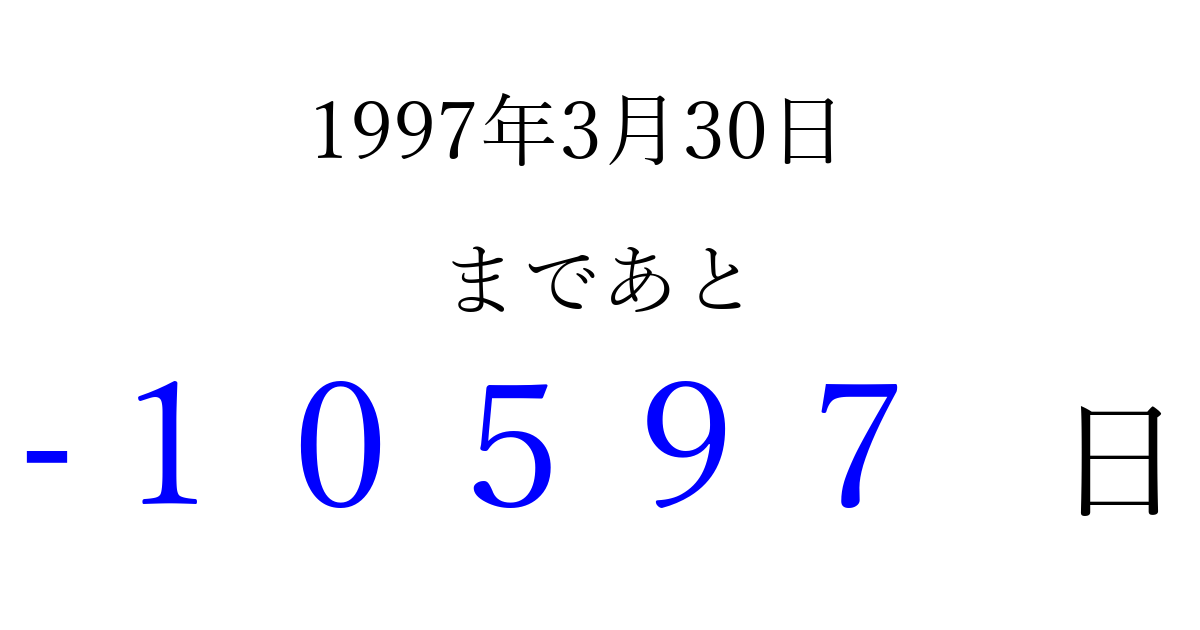 1997年3月30日(日)は もう 00000 日過ぎました 追加すると、トップページからすぐ選べるようになります ※2026/04/04現在の結果です。 最新の状態に更新する ↓シェアして、タイムライン上にカウントダウンを表示しよう!↓ 📤 この結果を共有する Tweet シェア Threads Bluesky 別の日付でカウントダウン 1997年3月のカレンダー このページをブックマークに追加すると、いつでもカウントダウンを確認できます。 (PC: Ctrl+D / Mac: ⌘+D) hitome-notes.comでは以下のページも運営しています。 指定日と期間から日付を計算 | ガチャ確率計算・シミュレーション | プライバシー・ポリシー 運営者:Avocado