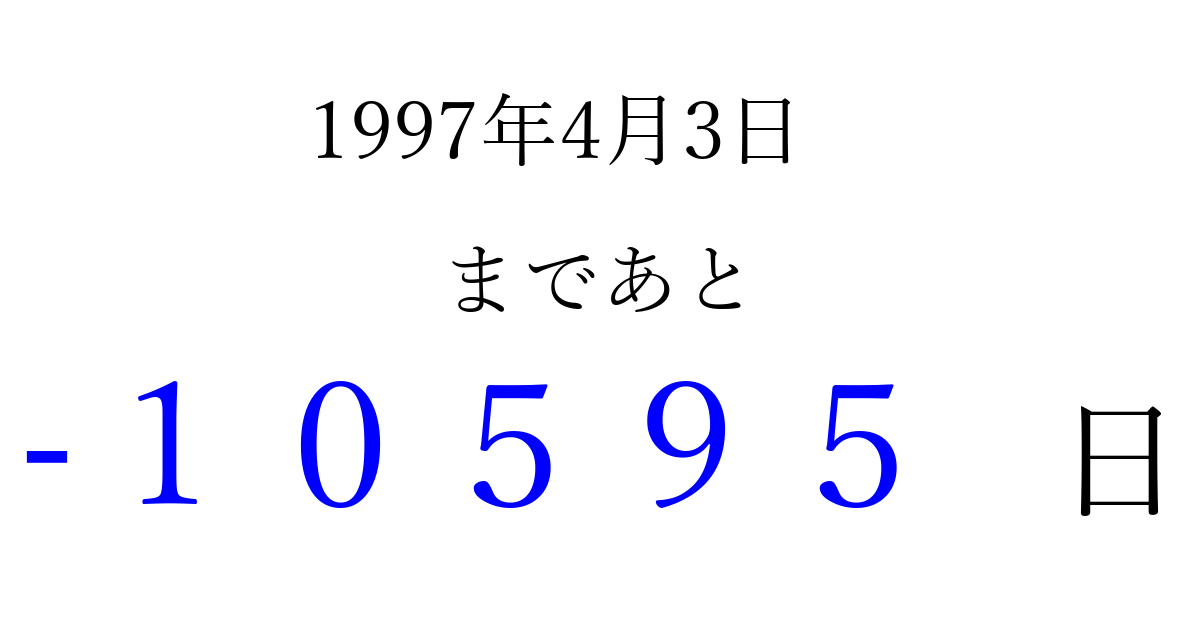 1997年4月3日(木)は もう 00000 日過ぎました 追加すると、トップページからすぐ選べるようになります ※2026/04/06現在の結果です。 最新の状態に更新する ↓シェアして、タイムライン上にカウントダウンを表示しよう!↓ 📤 この結果を共有する Tweet シェア Threads Bluesky 別の日付でカウントダウン 1997年4月のカレンダー このページをブックマークに追加すると、いつでもカウントダウンを確認できます。 (PC: Ctrl+D / Mac: ⌘+D) hitome-notes.comでは以下のページも運営しています。 指定日と期間から日付を計算 | ガチャ確率計算・シミュレーション | プライバシー・ポリシー 運営者:Avocado