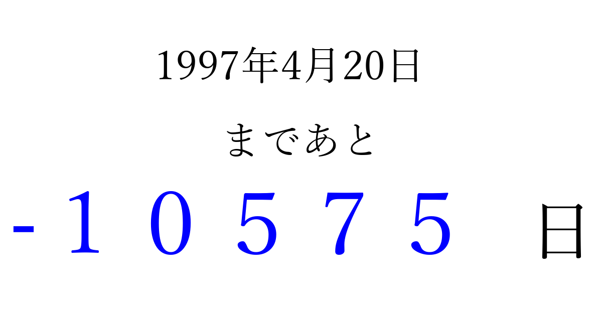 1997年4月20日(日)は もう 00000 日過ぎました 追加すると、トップページからすぐ選べるようになります ※2026/04/03現在の結果です。 最新の状態に更新する ↓シェアして、タイムライン上にカウントダウンを表示しよう!↓ 📤 この結果を共有する Tweet シェア Threads Bluesky 別の日付でカウントダウン 1997年4月のカレンダー このページをブックマークに追加すると、いつでもカウントダウンを確認できます。 (PC: Ctrl+D / Mac: ⌘+D) hitome-notes.comでは以下のページも運営しています。 指定日と期間から日付を計算 | ガチャ確率計算・シミュレーション | プライバシー・ポリシー 運営者:Avocado