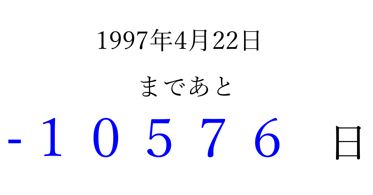 1997年4月22日(火)は もう 00000 日過ぎました 追加すると、トップページからすぐ選べるようになります ※2026/04/06現在の結果です。 最新の状態に更新する ↓シェアして、タイムライン上にカウントダウンを表示しよう!↓ 📤 この結果を共有する Tweet シェア Threads Bluesky 別の日付でカウントダウン 1997年4月のカレンダー このページをブックマークに追加すると、いつでもカウントダウンを確認できます。 (PC: Ctrl+D / Mac: ⌘+D) hitome-notes.comでは以下のページも運営しています。 指定日と期間から日付を計算 | ガチャ確率計算・シミュレーション | プライバシー・ポリシー 運営者:Avocado