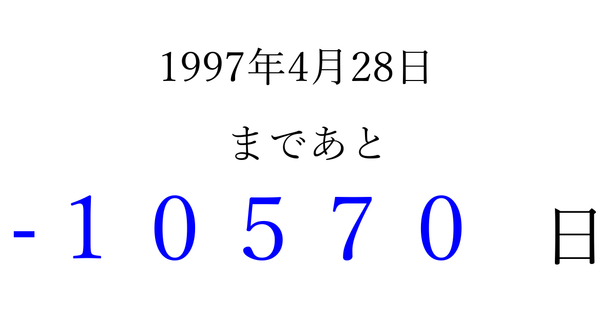 1997年4月28日(月)は もう 00000 日過ぎました 追加すると、トップページからすぐ選べるようになります ※2026/04/06現在の結果です。 最新の状態に更新する ↓シェアして、タイムライン上にカウントダウンを表示しよう!↓ 📤 この結果を共有する Tweet シェア Threads Bluesky 別の日付でカウントダウン 1997年4月のカレンダー このページをブックマークに追加すると、いつでもカウントダウンを確認できます。 (PC: Ctrl+D / Mac: ⌘+D) hitome-notes.comでは以下のページも運営しています。 指定日と期間から日付を計算 | ガチャ確率計算・シミュレーション | プライバシー・ポリシー 運営者:Avocado