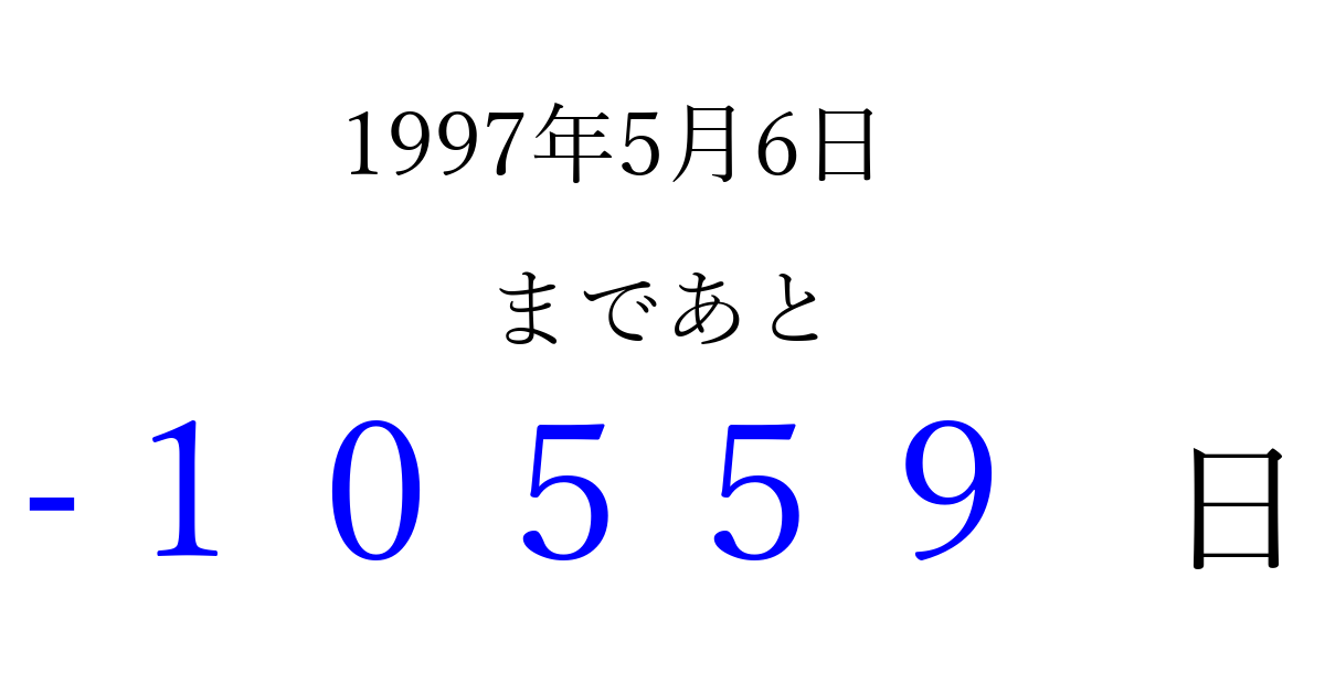 1997年5月6日(火)は もう 00000 日過ぎました 追加すると、トップページからすぐ選べるようになります ※2026/04/03現在の結果です。 最新の状態に更新する ↓シェアして、タイムライン上にカウントダウンを表示しよう!↓ 📤 この結果を共有する Tweet シェア Threads Bluesky 別の日付でカウントダウン 1997年5月のカレンダー このページをブックマークに追加すると、いつでもカウントダウンを確認できます。 (PC: Ctrl+D / Mac: ⌘+D) hitome-notes.comでは以下のページも運営しています。 指定日と期間から日付を計算 | ガチャ確率計算・シミュレーション | プライバシー・ポリシー 運営者:Avocado