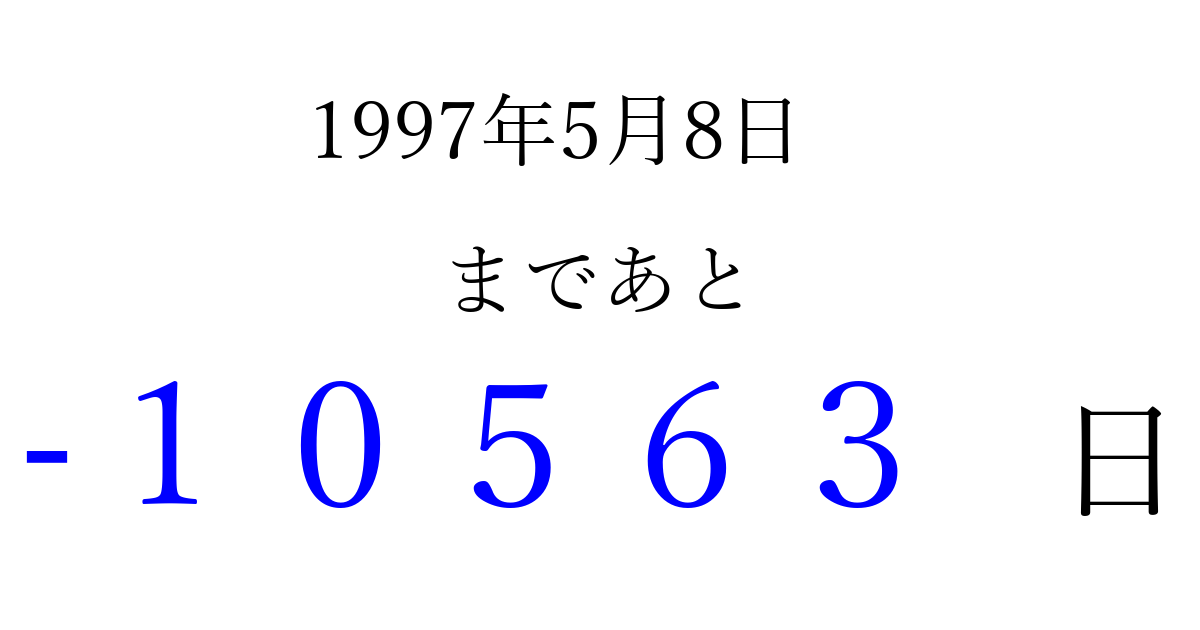 1997年5月8日(木)は もう 00000 日過ぎました 追加すると、トップページからすぐ選べるようになります ※2026/04/09現在の結果です。 最新の状態に更新する ↓シェアして、タイムライン上にカウントダウンを表示しよう!↓ 📤 この結果を共有する Tweet シェア Threads Bluesky 別の日付でカウントダウン 1997年5月のカレンダー このページをブックマークに追加すると、いつでもカウントダウンを確認できます。 (PC: Ctrl+D / Mac: ⌘+D) hitome-notes.comでは以下のページも運営しています。 指定日と期間から日付を計算 | ガチャ確率計算・シミュレーション | プライバシー・ポリシー 運営者:Avocado