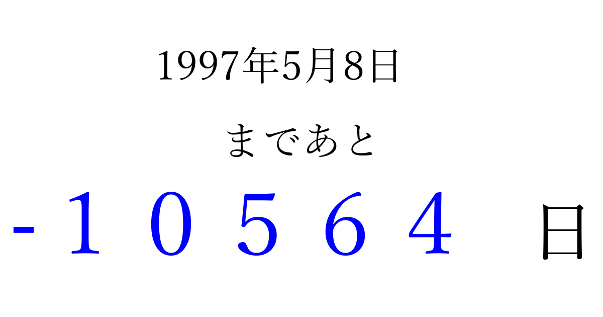 1997年5月8日(木)は もう 00000 日過ぎました 追加すると、トップページからすぐ選べるようになります ※2026/04/10現在の結果です。 最新の状態に更新する ↓シェアして、タイムライン上にカウントダウンを表示しよう!↓ 📤 この結果を共有する Tweet シェア Threads Bluesky 別の日付でカウントダウン 1997年5月のカレンダー このページをブックマークに追加すると、いつでもカウントダウンを確認できます。 (PC: Ctrl+D / Mac: ⌘+D) hitome-notes.comでは以下のページも運営しています。 指定日と期間から日付を計算 | ガチャ確率計算・シミュレーション | プライバシー・ポリシー 運営者:Avocado