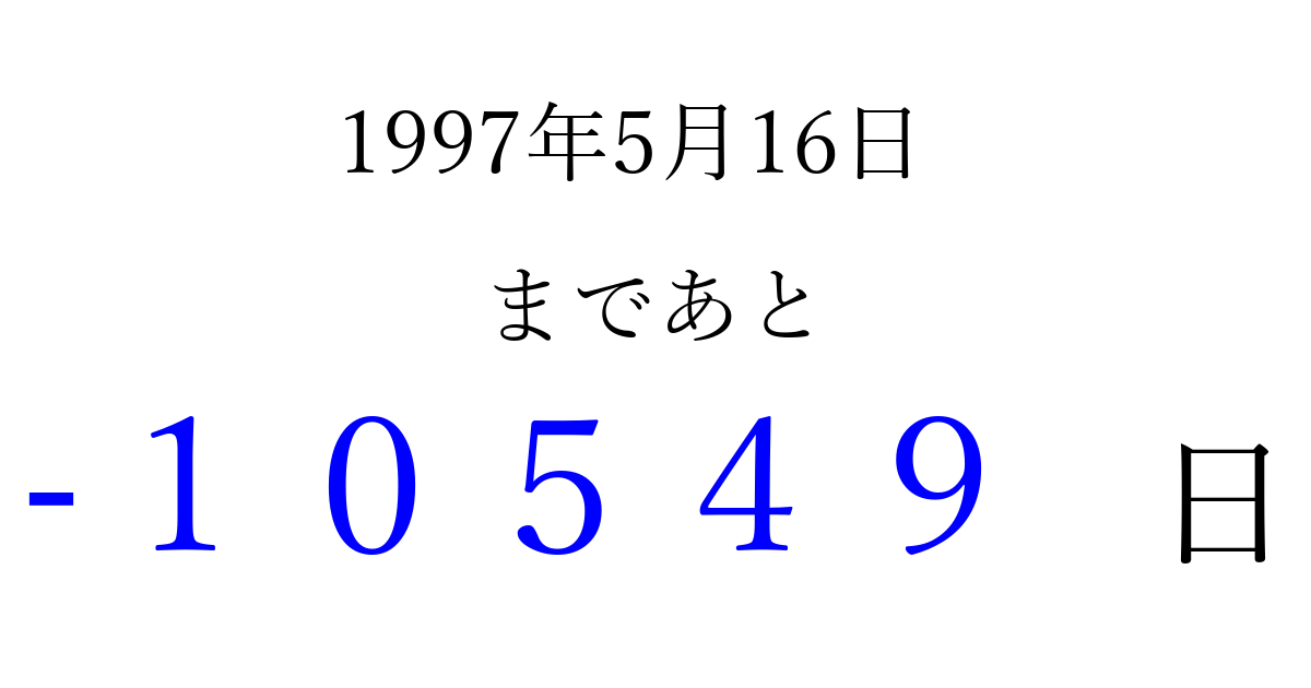 1997年5月16日(金)は もう 00000 日過ぎました 追加すると、トップページからすぐ選べるようになります ※2026/04/03現在の結果です。 最新の状態に更新する ↓シェアして、タイムライン上にカウントダウンを表示しよう!↓ 📤 この結果を共有する Tweet シェア Threads Bluesky 別の日付でカウントダウン 1997年5月のカレンダー このページをブックマークに追加すると、いつでもカウントダウンを確認できます。 (PC: Ctrl+D / Mac: ⌘+D) hitome-notes.comでは以下のページも運営しています。 指定日と期間から日付を計算 | ガチャ確率計算・シミュレーション | プライバシー・ポリシー 運営者:Avocado