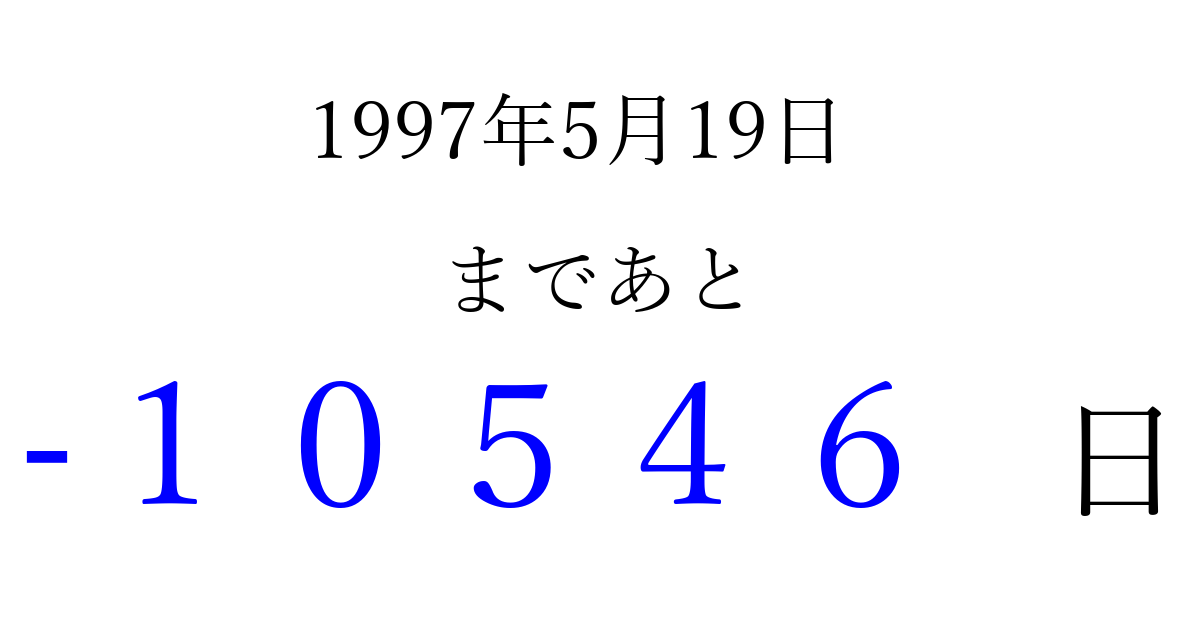 1997年5月19日(月)は もう 00000 日過ぎました 追加すると、トップページからすぐ選べるようになります ※2026/04/03現在の結果です。 最新の状態に更新する ↓シェアして、タイムライン上にカウントダウンを表示しよう!↓ 📤 この結果を共有する Tweet シェア Threads Bluesky 別の日付でカウントダウン 1997年5月のカレンダー このページをブックマークに追加すると、いつでもカウントダウンを確認できます。 (PC: Ctrl+D / Mac: ⌘+D) hitome-notes.comでは以下のページも運営しています。 指定日と期間から日付を計算 | ガチャ確率計算・シミュレーション | プライバシー・ポリシー 運営者:Avocado