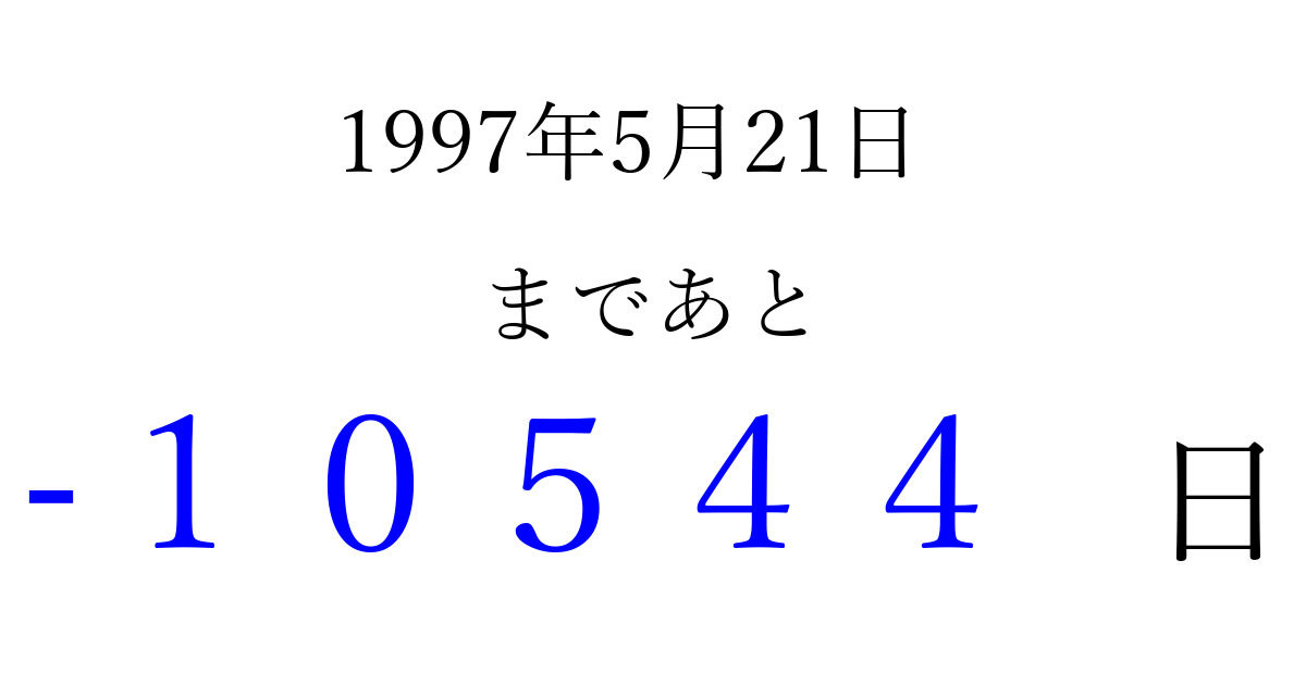 1997年5月21日(水)は もう 00000 日過ぎました 追加すると、トップページからすぐ選べるようになります ※2026/04/03現在の結果です。 最新の状態に更新する ↓シェアして、タイムライン上にカウントダウンを表示しよう!↓ 📤 この結果を共有する Tweet シェア Threads Bluesky 別の日付でカウントダウン 1997年5月のカレンダー このページをブックマークに追加すると、いつでもカウントダウンを確認できます。 (PC: Ctrl+D / Mac: ⌘+D) hitome-notes.comでは以下のページも運営しています。 指定日と期間から日付を計算 | ガチャ確率計算・シミュレーション | プライバシー・ポリシー 運営者:Avocado
