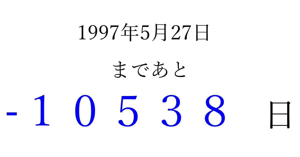 1997年5月27日(火)は もう 00000 日過ぎました 追加すると、トップページからすぐ選べるようになります ※2026/04/03現在の結果です。 最新の状態に更新する ↓シェアして、タイムライン上にカウントダウンを表示しよう!↓ 📤 この結果を共有する Tweet シェア Threads Bluesky 別の日付でカウントダウン 1997年5月のカレンダー このページをブックマークに追加すると、いつでもカウントダウンを確認できます。 (PC: Ctrl+D / Mac: ⌘+D) hitome-notes.comでは以下のページも運営しています。 指定日と期間から日付を計算 | ガチャ確率計算・シミュレーション | プライバシー・ポリシー 運営者:Avocado