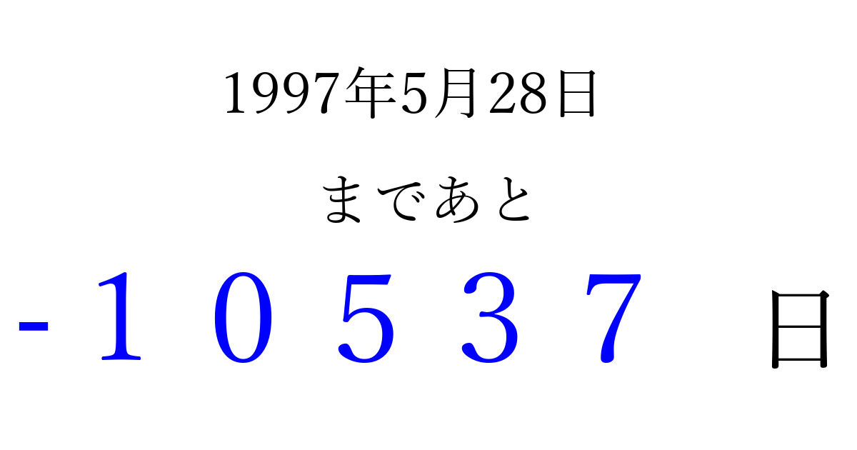 1997年5月28日(水)は もう 00000 日過ぎました 追加すると、トップページからすぐ選べるようになります ※2026/04/03現在の結果です。 最新の状態に更新する ↓シェアして、タイムライン上にカウントダウンを表示しよう!↓ 📤 この結果を共有する Tweet シェア Threads Bluesky 別の日付でカウントダウン 1997年5月のカレンダー このページをブックマークに追加すると、いつでもカウントダウンを確認できます。 (PC: Ctrl+D / Mac: ⌘+D) hitome-notes.comでは以下のページも運営しています。 指定日と期間から日付を計算 | ガチャ確率計算・シミュレーション | プライバシー・ポリシー 運営者:Avocado