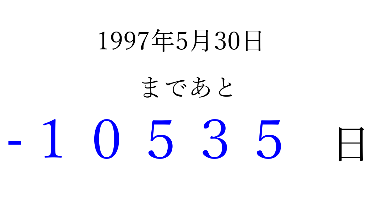 1997年5月30日(金)は もう 00000 日過ぎました 追加すると、トップページからすぐ選べるようになります ※2026/04/03現在の結果です。 最新の状態に更新する ↓シェアして、タイムライン上にカウントダウンを表示しよう!↓ 📤 この結果を共有する Tweet シェア Threads Bluesky 別の日付でカウントダウン 1997年5月のカレンダー このページをブックマークに追加すると、いつでもカウントダウンを確認できます。 (PC: Ctrl+D / Mac: ⌘+D) hitome-notes.comでは以下のページも運営しています。 指定日と期間から日付を計算 | ガチャ確率計算・シミュレーション | プライバシー・ポリシー 運営者:Avocado