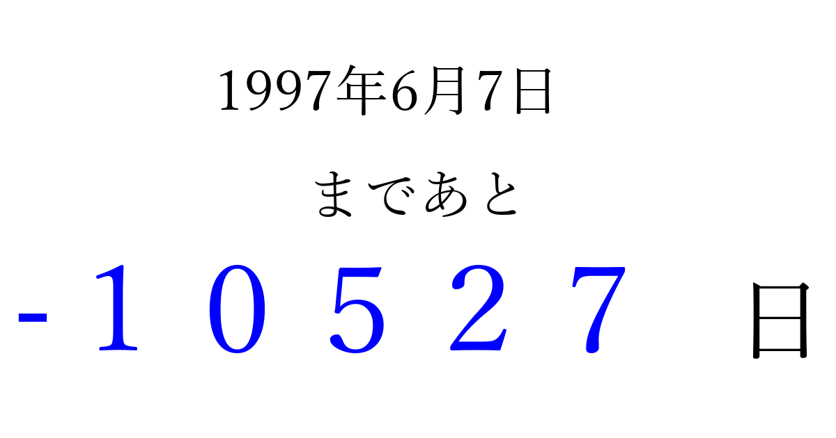 1997年6月7日(土)は もう 00000 日過ぎました 追加すると、トップページからすぐ選べるようになります ※2026/04/03現在の結果です。 最新の状態に更新する ↓シェアして、タイムライン上にカウントダウンを表示しよう!↓ 📤 この結果を共有する Tweet シェア Threads Bluesky 別の日付でカウントダウン 1997年6月のカレンダー このページをブックマークに追加すると、いつでもカウントダウンを確認できます。 (PC: Ctrl+D / Mac: ⌘+D) hitome-notes.comでは以下のページも運営しています。 指定日と期間から日付を計算 | ガチャ確率計算・シミュレーション | プライバシー・ポリシー 運営者:Avocado