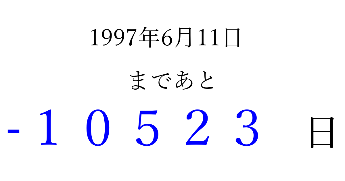 1997年6月11日(水)は もう 00000 日過ぎました 追加すると、トップページからすぐ選べるようになります ※2026/04/03現在の結果です。 最新の状態に更新する ↓シェアして、タイムライン上にカウントダウンを表示しよう!↓ 📤 この結果を共有する Tweet シェア Threads Bluesky 別の日付でカウントダウン 1997年6月のカレンダー このページをブックマークに追加すると、いつでもカウントダウンを確認できます。 (PC: Ctrl+D / Mac: ⌘+D) hitome-notes.comでは以下のページも運営しています。 指定日と期間から日付を計算 | ガチャ確率計算・シミュレーション | プライバシー・ポリシー 運営者:Avocado