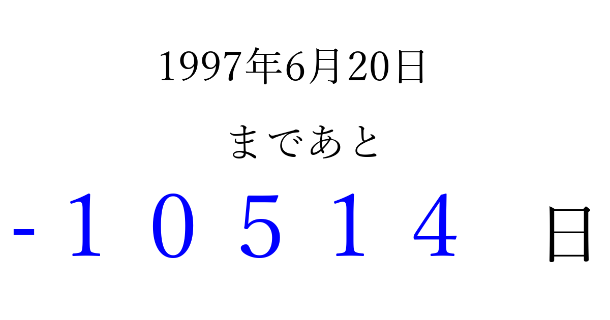 1997年6月20日(金)は もう 00000 日過ぎました 追加すると、トップページからすぐ選べるようになります ※2026/04/03現在の結果です。 最新の状態に更新する ↓シェアして、タイムライン上にカウントダウンを表示しよう!↓ 📤 この結果を共有する Tweet シェア Threads Bluesky 別の日付でカウントダウン 1997年6月のカレンダー このページをブックマークに追加すると、いつでもカウントダウンを確認できます。 (PC: Ctrl+D / Mac: ⌘+D) hitome-notes.comでは以下のページも運営しています。 指定日と期間から日付を計算 | ガチャ確率計算・シミュレーション | プライバシー・ポリシー 運営者:Avocado