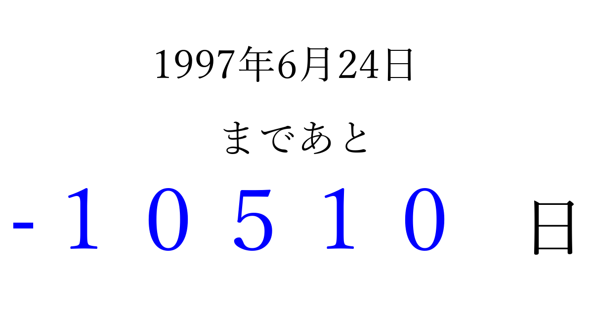 1997年6月24日(火)は もう 00000 日過ぎました 追加すると、トップページからすぐ選べるようになります ※2026/04/03現在の結果です。 最新の状態に更新する ↓シェアして、タイムライン上にカウントダウンを表示しよう!↓ 📤 この結果を共有する Tweet シェア Threads Bluesky 別の日付でカウントダウン 1997年6月のカレンダー このページをブックマークに追加すると、いつでもカウントダウンを確認できます。 (PC: Ctrl+D / Mac: ⌘+D) hitome-notes.comでは以下のページも運営しています。 指定日と期間から日付を計算 | ガチャ確率計算・シミュレーション | プライバシー・ポリシー 運営者:Avocado